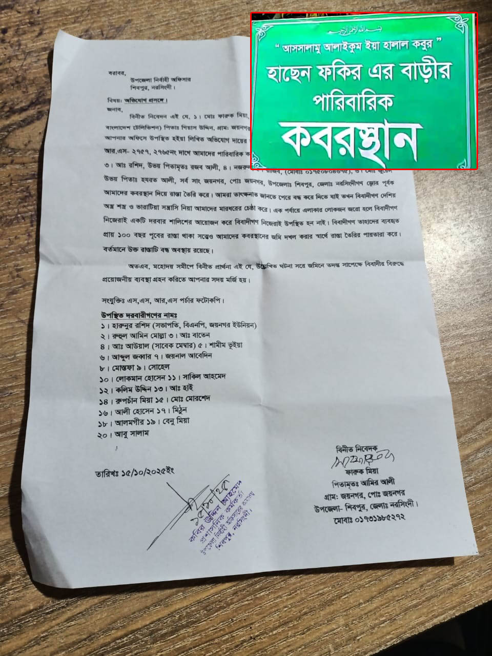 জানা গেছে, নরসিংদী জেলার শিবপুর উপজেলার অন্তর্গত জয়নগর ইউনিয়নের পশ্চিম পাড়ার মৃত হাছেন ফকিরের বাড়ি। সেই বাড়ির ওয়ারিশদার হচ্ছেন হাছেন ফকিরের নাতি ফারুক মিয়া, খোকন মিয়া, বেনু মিয়া, সামসুল-সোহেল-গোলাপ মিয়া-মোরশেদ। তাদের বসত বাড়ির পাশে রয়েছে একটি পারিবারিক কবরস্থান। যেই কবরস্থানে রয়েছে ফারুক মিয়াদের দাদা- হাছেন আলী ফকির, দাদী মনোয়ারা বেগম, চাচা সিরাজুল ইসলাম, চাচী নূরজাহান বেগম, চাচা তো বোন আনোয়ারাসহ তিন পুরুষের কবর। যেখানে জায়গার পরিমাণ মোট ৮ শতাংশের মতো। ঐ জায়গাটি জোরপূর্বক দখলে নেয়ার চেষ্টা করছে রাজীব মিয়া, হযরত আলী, তাহের আলী, জুয়েল, রশিদ মিয়া গং। এমনকি কবরস্থানের উপর দিয়েই রাজীব-হযরত আলী গং ব্যক্তিগত রাস্তা নির্মাণের চেষ্টা করছে। তাদের এই কাজে সহযোগিতা করছে স্থানীয় কিছু মাস্তান আর মাদকাসক্তদের একটি দল। অথচ কবরস্থানসহ এই জায়গার প্রকৃত মালিক হাছেন ফকিরের ওয়ারিশদারগণ।
