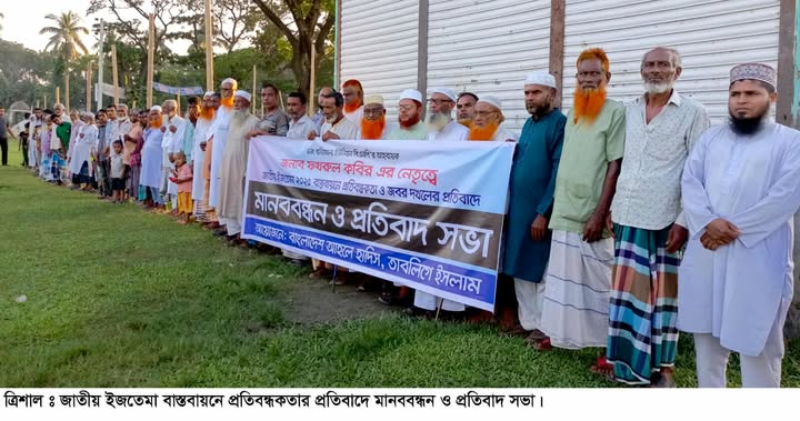বাংলাদেশ আহলে হাদিস তাবলীগে ইসলামের জাতীয় ইজতেমা-২০২৫ বাস্তবায়নে প্রতিবন্ধকতা সহ জবর দখলের প্রতিবাদে ময়মনসিংহের ত্রিশালে মানববন্ধন ও প্রতিবাদ সভা অনুষ্ঠিত হয়েছে।