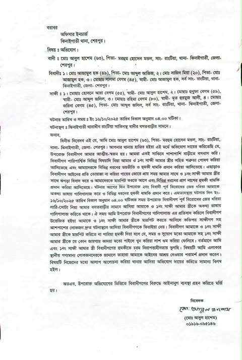 এরি জেরে গত ১৬ অক্টোবর বিকেল ৪টার দিকে অভিযুক্তরা লাঠিসোটা নিয়ে বাদীর বাড়ির সামনে এসে অশালীন ভাষায় গালিগালাজ শুরু করেন। এসময় প্রতিবাদ করলে তারা ক্ষিপ্ত হয়ে বাদী ও তার স্ত্রীকে মারধরের চেষ্টা চালান। স্থানীয় লোকজন দ্রুত এগিয়ে এলে অভিযুক্তরা পালিয়ে যায়। পালানোর সময় অভিযুক্তরা বাদী দম্পতিকে হত্যার হুমকি দিয়ে বলেন, “সময় ও সুযোগ পেলে তোমাদের মেরে লাশ গুম করে ফেলবো। ”ফলে বাদী ও তার স্ত্রী বর্তমানে চরম নিরাপত্তাহীনতায় ভুগছেন বলে অভিযোগে উল্লেখ করা হয়েছে।