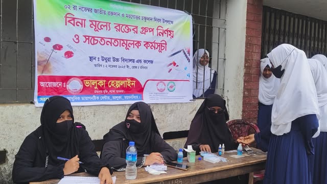 জাতীয় স্বেচ্ছায় রক্তদাতা দিবস উপলক্ষে ময়মনসিংহের ভালুকায় স্বেচ্ছাসেবী সংগঠন ‘ভালুকা হেল্পলাইন’ এর উদ্যোগে বিনামূল্যে রক্তের গ্রুপ নির্ণয় ও সচেতনতামূলক ক্যাম্পেইন অনুষ্ঠিত হয়েছে। শনিবার (২ নভেম্বর) উথুরা উচ্চ বিদ্যালয় ও কলেজ প্রাঙ্গণে দিনব্যাপী এ কর্মসূচি পালন করা হয়।