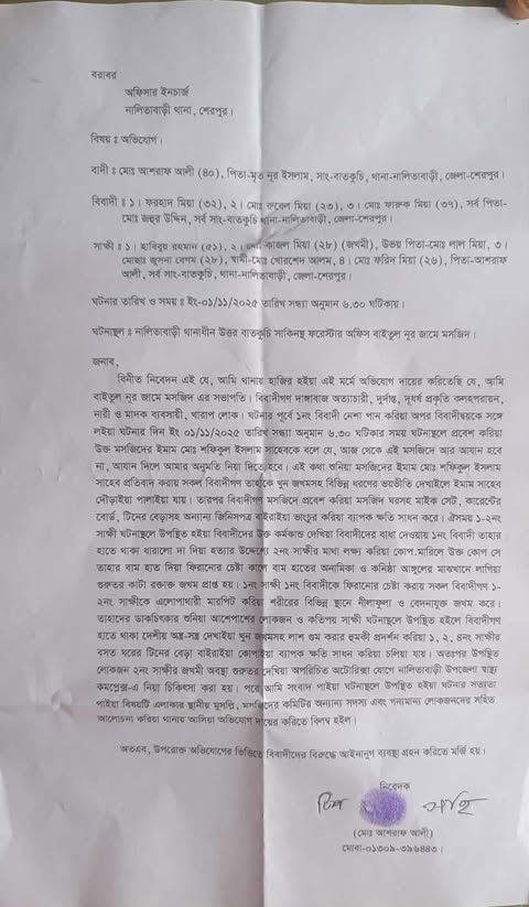 এ ব্যাপারে নালিতাবাড়ী থানার ভারপ্রাপ্ত কর্মকর্তা (ওসি) মো. সোহেল রানা বলেন, “মসজিদে ঢুকে হামলা ও ভাংচুরের ঘটনায় একটি লিখিত অভিযোগ পেয়েছি। বিষয়টি তদন্ত করে প্রয়োজনীয় আইনগত ব্যবস্থা নেওয়া হবে।”