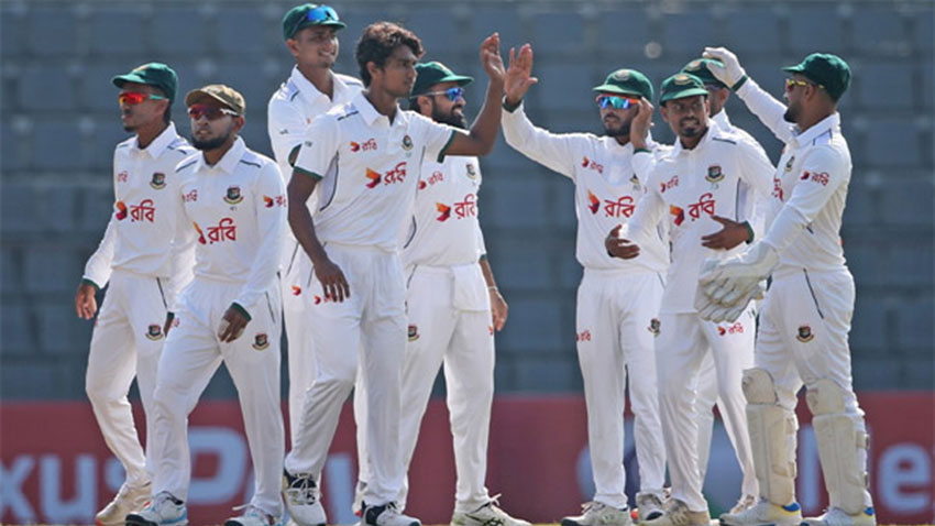 বাংলাদেশের মেহেদী হাসান মিরাজ ৩টি, হাসান মুরাদ ২টি এবং তাইজুল, হাসান মাহমুদ আর নাহিদ রানা নিয়েছেন একটি করে উইকেট।