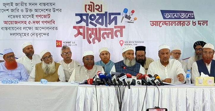 তা ছাড়া সংবাদ সম্মেলনে ১৩ ও ১৪ নভেম্বর কর্মসূচি ঘোষণা দেওয়া হয়। বলা হয়, ১৩ নভেম্বর ফ্যাসিবাদী শক্তির নাশকতা ও অপতৎপরতা প্রতিরোধে ৮ দলের নেতৃবৃন্দ সর্বস্তরের জনশক্তিসহ দেশব্যাপী রাজপথে অবস্থান করবেন।