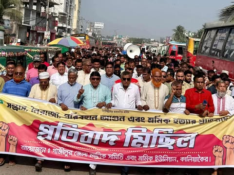 গাজীপুর জেলা মালিক সমিতি এবং শ্রমিক ইউনিয়নের উদ্যোগে সন্ত্রাস, নৈরাজ্য, পরিবহনে আগুন ও শ্রমিক হত্যার প্রতিবাদে বিক্ষোভ মিছিল অনুষ্ঠিত হয়েছে। বিক্ষোভ মিছিলটি কালিয়াকৈর বাস টার্মিনাল থেকে শুরু করে প্রধান প্রধান সড়ক প্রদক্ষিণ করে। উক্ত বিক্ষোভ মিছিলে অংশগ্রহণ করেন কেন্দ্রীয় বিএনপির শ্রম বিষয়ক সহ সম্পাদক হুমায়ুন কবির খান, জেলা শ্রমিক দলের আহবায়ক মিনার উদ্দিন, পৌর বিএনপির সাবেক সাধারণ সম্পাদক রিয়াজ উদ্দিন, বীর মুক্তিযোদ্ধা আক্তার উজ্জামান, জেলা বিএনপির সাবেক সহ সভাপতি হযরত আলী মিলন, কালিয়াকৈর ডিগ্রি কলেজের সাবেক ভিপি শামীম হোসেন প্রমুখ।