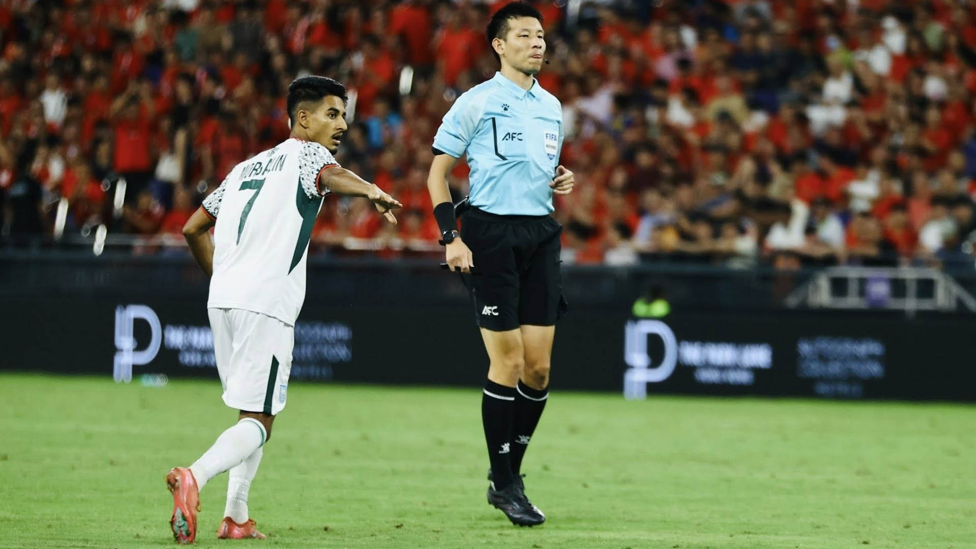 বাম দিক থেকে রাকিব যে ক্রসটি নেন তাতে দুর্দান্তভাবে কানেক্ট করেন মোরসালিন। ভারতীয় গোলরক্ষক এগিয়ে এসেও শেষ রক্ষা করতে পারেননি। গোল...। বাংলাদেশ এগিয়ে যায় ১-০ ব্যবধানে।