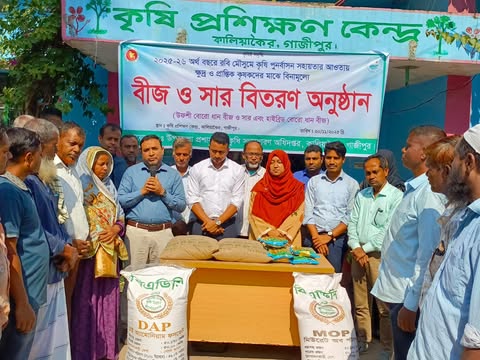 গাজীপুরের কালিয়াকৈরে উপজেলা প্রশাসন ও কৃষি সম্প্রসারণ অধিদপ্তরের উদ্যোগে উপজেলা পরিষদের মিলনায়তনে বৃহস্পতিবার সকালে উফশী বোরো মৌসুমে ক্ষুদ্র ও প্রান্তিক কৃষকদের মাঝে বিনামূ্ল্য বীজ ও সার বিতরণ করা হয়েছে।
