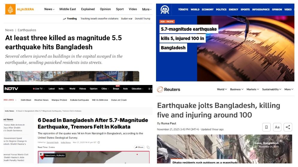 সংবাদ সংস্থা রয়টার্স ও আনাদোলু বাংলাদেশে ভূমিকম্পের খবর দিয়েছে। এছাড়াও আল-জাজিরা, ডেইলি সাবাহ, এবিসি নিউজ, টিআরটি ওয়ার্ল্ড, ডয়চে ভেলে, আল আরবিয়া, দ্য ডনসহ বিভিন্ন সংবাদমাধ্যম এ খবর প্রকাশ করেছে।