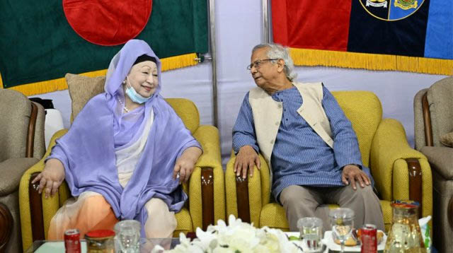 বিএনপির মিডিয়া সেল থেকে জানানো হয়েছে, শুক্রবার রাজধানীর সেনানিবাসে সশস্ত্র বাহিনী দিবস উপলক্ষে আয়োজিত অনুষ্ঠানের সাইডলাইনে প্রধান উপদেষ্টা প্রফেসর মুহাম্মদ ইউনূস ও বিএনপি চেয়ারপারসন বেগম খালেদা জিয়া পারষ্পরিক সৌজন্য বিনিময় করেন। প্রধান উপদেষ্টা এ সময় সাবেক প্রধানমন্ত্রী বেগম খালেদা জিয়ার বর্তমান শারীরিক অবস্থার বিষয়ে খোঁজ নেন এবং তার সুস্থতা কামনা করেন। বিএনপি চেয়ারপারসন খালেদা জিয়া প্রধান উপদেষ্টাকে ধন্যবাদ জানান। তিনি প্রধান উপদেষ্টার সহধর্মিণী আফরোজী ইউনূসের শারীরিক অবস্থার খোঁজ নেন এবং শুভকামনা জানান।