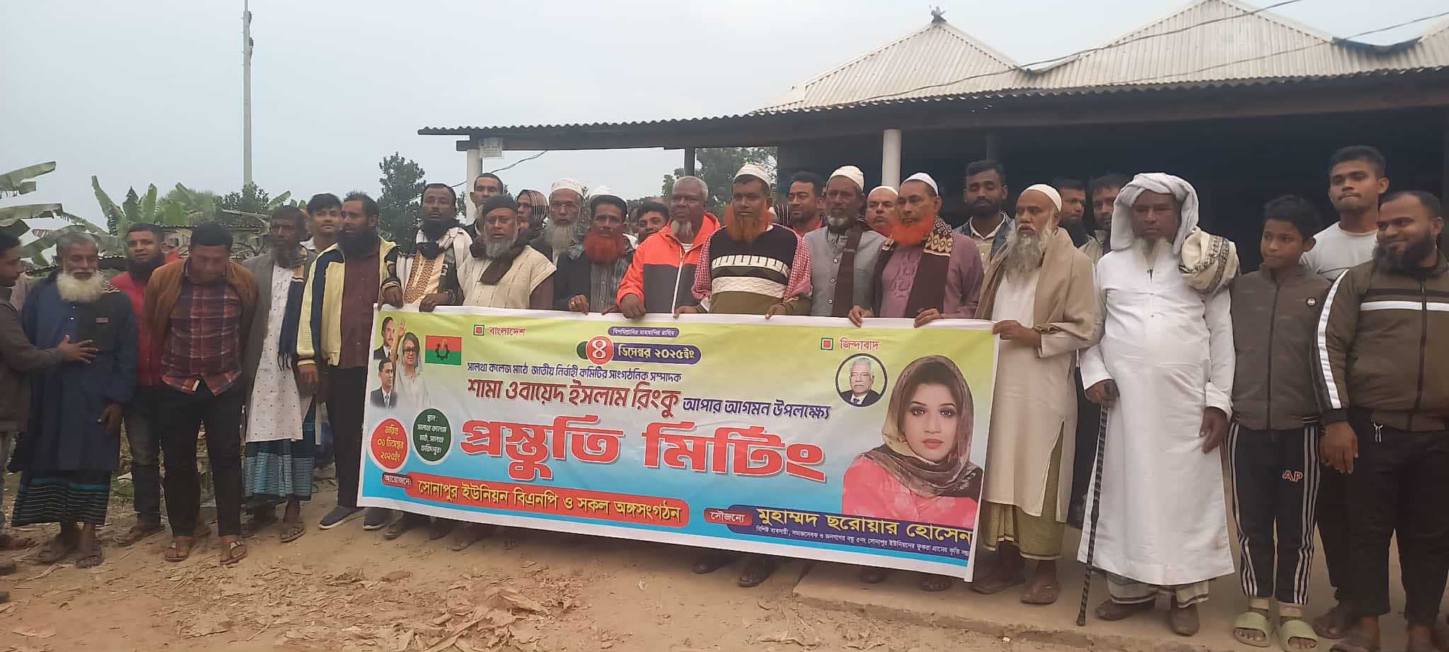 সোনাপুর ইউনিয়ন বিএনপির সাবেক সভাপতি মো: আজিজুল হক এর সভাপত্তিত্বে ও সালথা যুবদল নেতা মো: মানোয়ার হোসন এর সঞ্চালনায় প্রস্তুতি সভায় এসময় উপস্থিত ছিলেন বিএনপি নেতা মো: রহুল মাতুব্বর, মো: তারা মিয়া,আইয়ুব মাস্টার,মো: বাদশা মোল্লা,মান্নান মোল্লা, যুবদল নেতা মো: লিয়াকত হোসেন,মো: কামরুল মাতুব্বর, মো: শহিদুল ইসলাম।