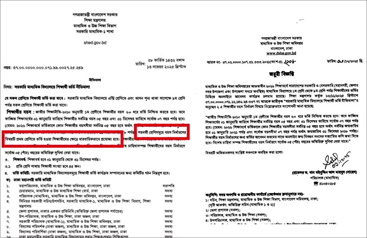 এতে আরও বলা হয়েছে, শিক্ষার্থীর বয়স নির্ধারণের জন্য ভর্তির আবেদন ফরমের সঙ্গে অনলাইন জন্ম নিবন্ধন সনদের সত্যায়িত কপি জমা দিতে হবে। বিশেষ চাহিদাসম্পন্ন শিক্ষার্থীদের বয়স নির্ধারণে সর্বোচ্চ ৫ বছরের অতিরিক্ত সুবিধা দেওয়া যাবে।